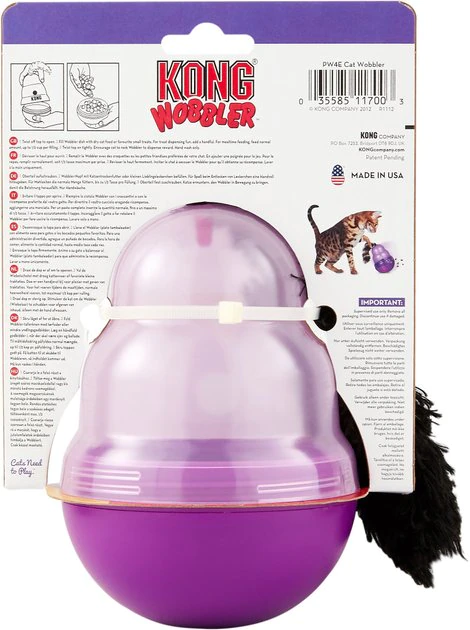 The KONG Cat Wobbler provides beneficial mental and physical stimulation for the household cat. With its entertaining wobbler action, the KONG Cat Wobbler makes playtime fun and rewarding by dispensing small treats. Used as a mealtime feeder, it also slows rapid eating and helps fight boredom and obesity by encouraging cats to work for their food.