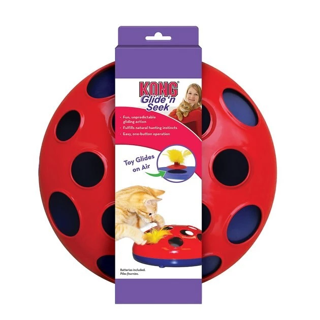 Cats will love the thrill of the chase with the new KONG Glide ‘n Seek toy. Magnetic levitation technology brings the feather toy to life—bouncing, jumping and spinning unpredictably. Peek-a-boo holes keep cats guessing as they hunt and chase. Each KONG Glide ‘n Seek includes two AA batteries and two feather toys.