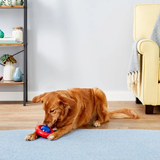 Watch your canine companion enjoy playtime with KONG Gyro Dog Toy. This irresistible toy entices and intrigues your pal with its rolling and flipping motion. It encourages your furry friend to push, paw and roll the toy around since it’s made with a center spinning orb and static outer ring for hours of enjoyment. Also, the more he pushes, paws and rolls, the more treats will come out for him to savor. The orbiting figure toy supports hours of independent play, so you can go back to completing your own duties. Plus, it’s available in small or large, so you can pick the best size for your pal.
