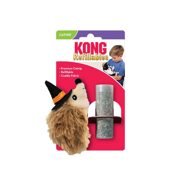 Give your kitty the purr-fect playmate with the KONG Halloween Refillables Hedgehog Cat Toy! These adorable hedgehog toys are made from soft, plush material, and they feature a resealable pouch to hold fresh catnip. These toys are machine-washable once the catnip is removed—which is an added purr-k for pet paw-rents and all the more reason to engage your feline fur-iend in active play. Plus, with the enticing scent of premium North American catnip you’ll want to play with your paw-tner all year long, not just for Howl-o-ween!