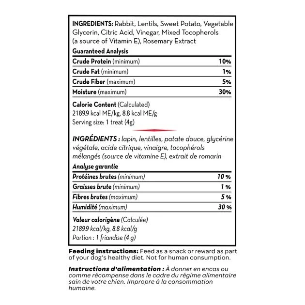 - Soft, chewy treats are oven baked with real rabbit and sweet potato.
