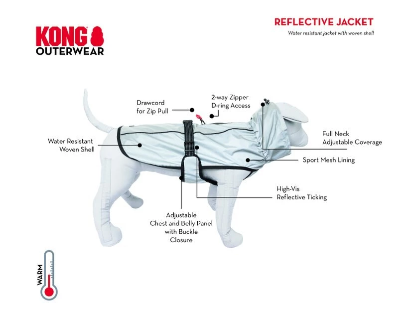 Remember to measure your pet for the paw-fect fit. Get your canine companion dressed and ready to go for his next ex-paw-dition in the KONG Reflective Dog Jacket! This stylish jacket is paw-fect for a long walk, a hike or a trip to the park. Not only is it fashionable, but it’s functional, too! It’s water-resistant, has an adjustable neck, plus it’s breathable, making it great for a variety of weather conditions!