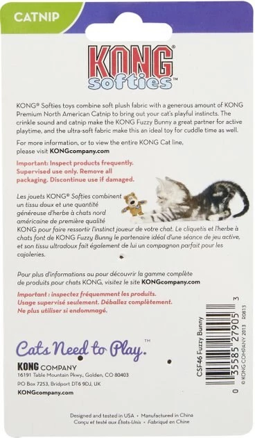 KONG Softies toys combine soft plush fabric with a generous amount of KONG Premium North American Catnip to bring out your cat’s playful instincts. The crinkle sound and catnip make the KONG Fuzzy Bunny a great toy for active playtime. The ultra-soft fabric makes this toy ideal for cuddle time as well.