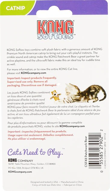 KONG Softies toys combine soft plush fabric with a generous amount of KONG Premium North American catnip to bring out your cat’s playful instincts. The crinkle sound and catnip encourage active play, while the ultra-soft fabric makes them ideal comfort toys as well.