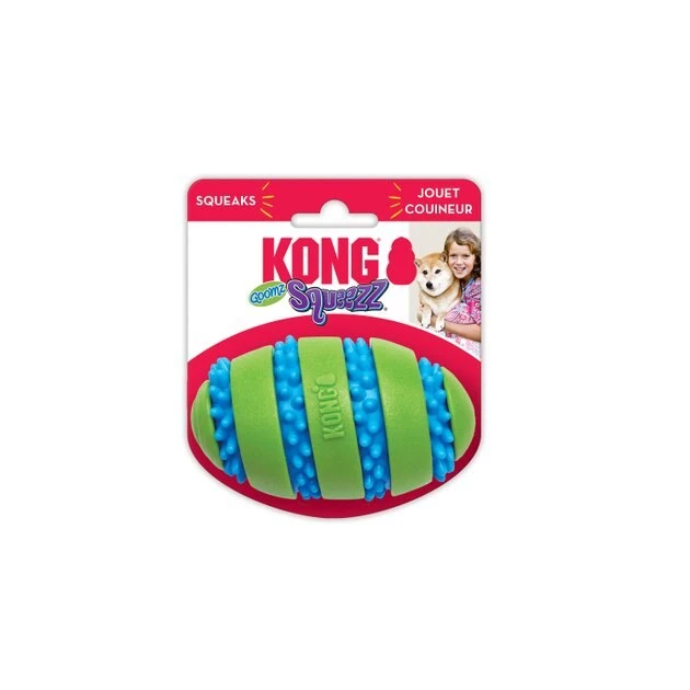 There’s nothing like a game of fetch in the backyard with your canine companion. KONG Squeezz Goomz Football Squeaky Plush Dog Toy is the perfect toy for indoor and outdoor fun! With a fun, squishable texture and durable materials, this football-shaped toy rewards appropriate chewing behavior. The raised nubs can even massage your dog’s teeth and gums. Plus, a squeaker inside encourages playtime and engagement–––so you and your dog will have a ball!